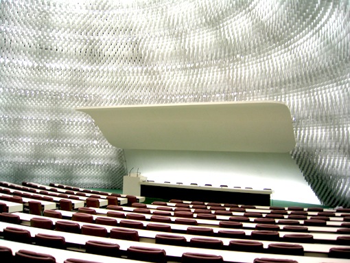 Niemeyer se transforma en un representante de Sudamérica en Europa, durante su desdichada época de exiliado político. Logró cosas asombrosas. Resalto de ellas el Campus Universitario de Argel, una enorme ave de hormigón, que extiende sus enormes alas sobre el suelo y cobija a los universitarios con su sombra. Otra obra niemeyerzca que merece ser resaltada el la sede que proyectara para el Partido Comunista en París. Niemeyer, miembro activo del Partido Comunista, tuvo la oportunidad de romper con un esquema cuadrado y caduco que hasta entonces sostenían sus colegas y coidearios, según el cual todo detalle que implique belleza debe ser considerado un lujo, y por ello, debe ser eliminado del proyecto. Este edificio tiene un rostro austero desde su exterior: una fachada de vidrio y una cúpula de hormigón brotando desde el césped frontal. Pero, en su interior, la luz juega un papel preciocista, y se convierte en el más bello de los ornamentos. Me sorprende que en las pasadas décadas no se haya usado el interior del auditorio para la filmación de una película futurista o algo semejante.